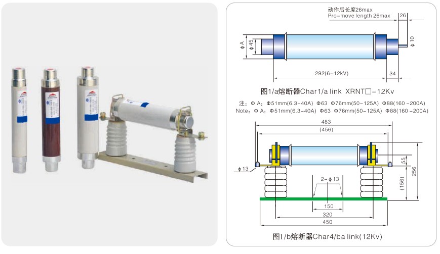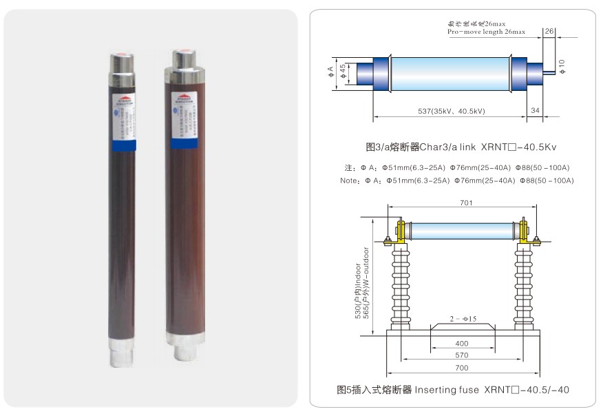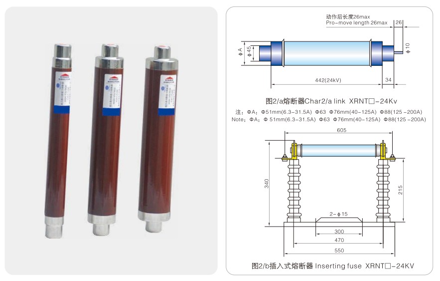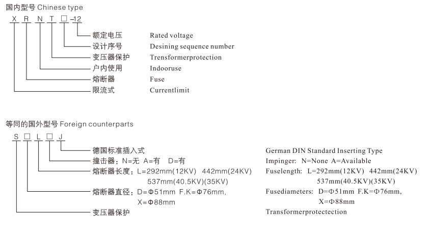 Модел Номинален напон Un(kV) Номинална струја на топење In(A) Големина на цевката за топење①xC(mm) Забелешки