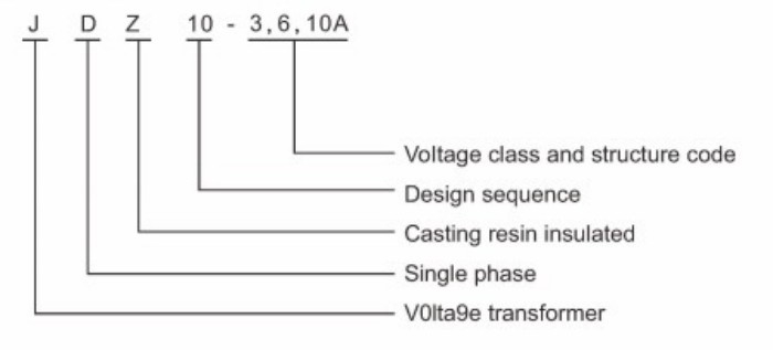 J = напонски трансформатор, D = еднофазен, Z = лиена изолација од епоксидна смола, 3/6/10 = Ниво на напон.